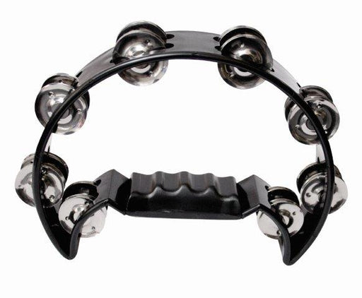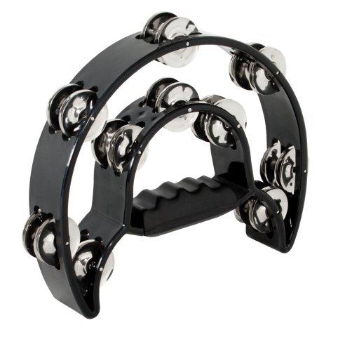 9 inch x 5 1/2 inch drum set tambourine. Headless. Double half moon. ABS rim. 10 pairs of nickle silver jingles in double row. Rubber reinforced ri...