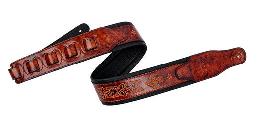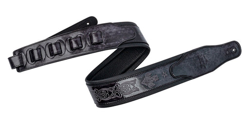 View full detailsXTR - 2½ inch garment leather guitar strap with internal padding and super soft black leather backing. Interweave adjustment. Intricate, vintage he...