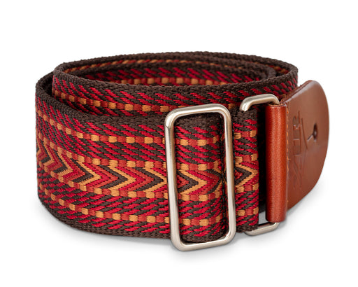 2 inch deluxe thick woven jacquard strap. Premium tan leather ends with smooth chrome slider adjustment. XTR display hanger. Rich vintage red.